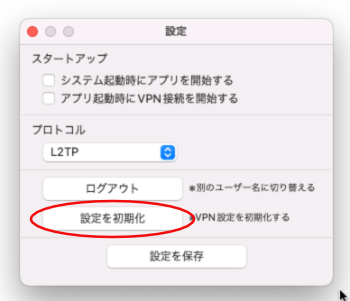 macOSのアップデート後などに、突然接続できなくなってしまった場合は、設定初期化ボタンをクリックして、再度ログインを行ってください。