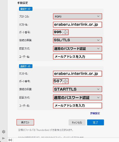 5.「次のアカウント設定が、指定されたサーバーを調べることによりみつかりました」と表示されたら「完了」をクリックします。