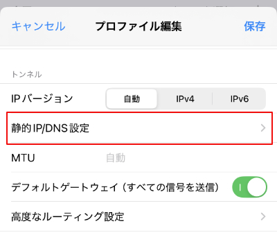 3.静的IP/DNS設定をタップして、固定IPアドレスとDNSを入力します。