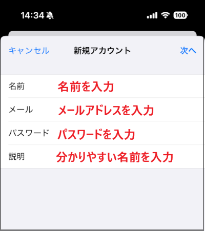 8.新規アカウントの画面が表示されます。それぞれ下記のように入力して、右上の「次へ」をタップします。