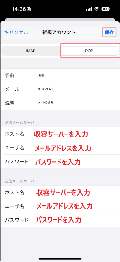 9.POPを選択し、各設定項目を下記のように入力して、画面右上の「保存」をタップします。