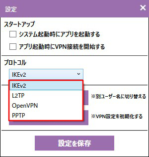 初期値は「IKEv2」となっております。お客様側で他の通信方式を変更したいしたい場合は、画面右上の歯車マークから「設定」を開き、通信方式をご指定ください。