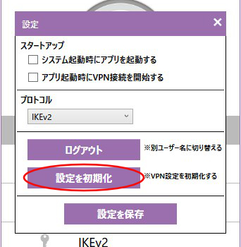 設定画面から「設定を初期化」ボタンをクリックすると現在のVPN設定を削除して再設定を行います。OSアップデート時などVPN接続に不具合が発生した際に初期化を実行してください。