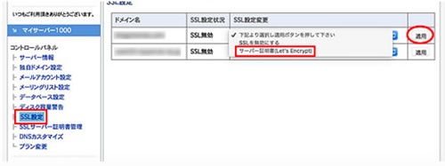 4.左カラムの「SSL設定」より該当ドメインのサーバー証明書を選択して「適用」をクリックします。