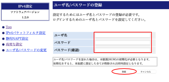 登録したユーザ名とパスワードは、紛失しないようにお客様にて管理してください。紛失した場合は、ホームゲートウェイの初期化が必要です。 |