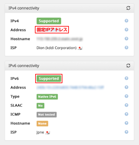 サイト上の表示が、IPv4に固定IPアドレスが表示され、IPv6がSupportedになっていれば接続成功です。