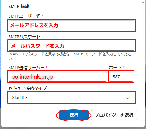5.次の表を参照にメールアカウントの設定情報を入力し、「続行」をクリックします。