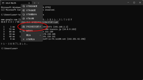 3.コマンド結果が表示されます。コマンドプロンプトのタブ上で右クリックを押し、「テキストのエクスポート」で結果がテキストファイルに保存できます。