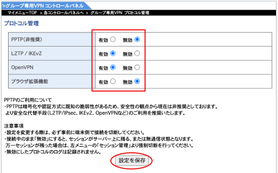 .プロトコルの「有効」「無効」を選択し、「設定を保存」をクリックします。