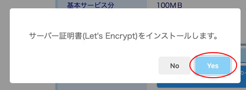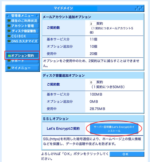 2.「オプション契約」の画面より、「サーバー証明書(Let's Encrypt)のインストール」をクリックします。