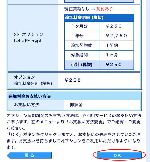 5.追加料金を確認して「OK」ボタンをクリックします。