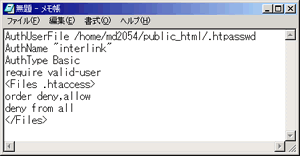 メモ帳やエディターで以下のように記述し、ファイル名を「.htpasswd.txt」として保存してください。
